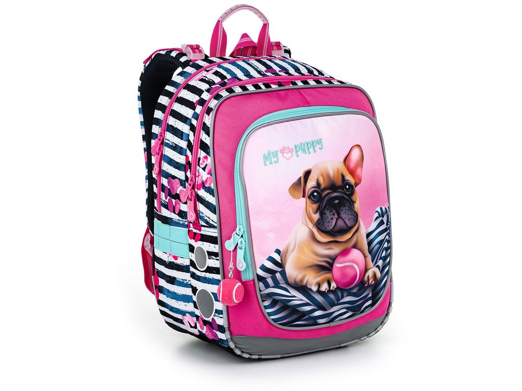 Dvě hlavní komory doplňuje na čele batohu hluboká kapsa. Zadní komora je širší, dejte do ní ty nejtěžší slabikáře a učebnice. Přední komora je o něco užší, ideální na přenášení penálu, krabičky se svačinou, nebo na další drobné školní potřeby. Malé deníčky a další drobnosti dejte do síťové kapsy na zip uvnitř přední komory. Nad ní je ještě jmenovka, aby se více stejných batohů ve třídě nepletlo. Uvnitř přední hluboké kapsy je pak odnímatelná karabina na klíče.