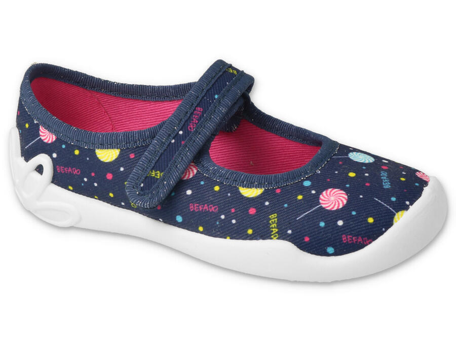 Bačkůrky od značky Befado s vícebarevným vzorem. Přezůvky odpovídají veškerým nárokům kladeným na zdravé a pohodlné obutí doma i ve školce.