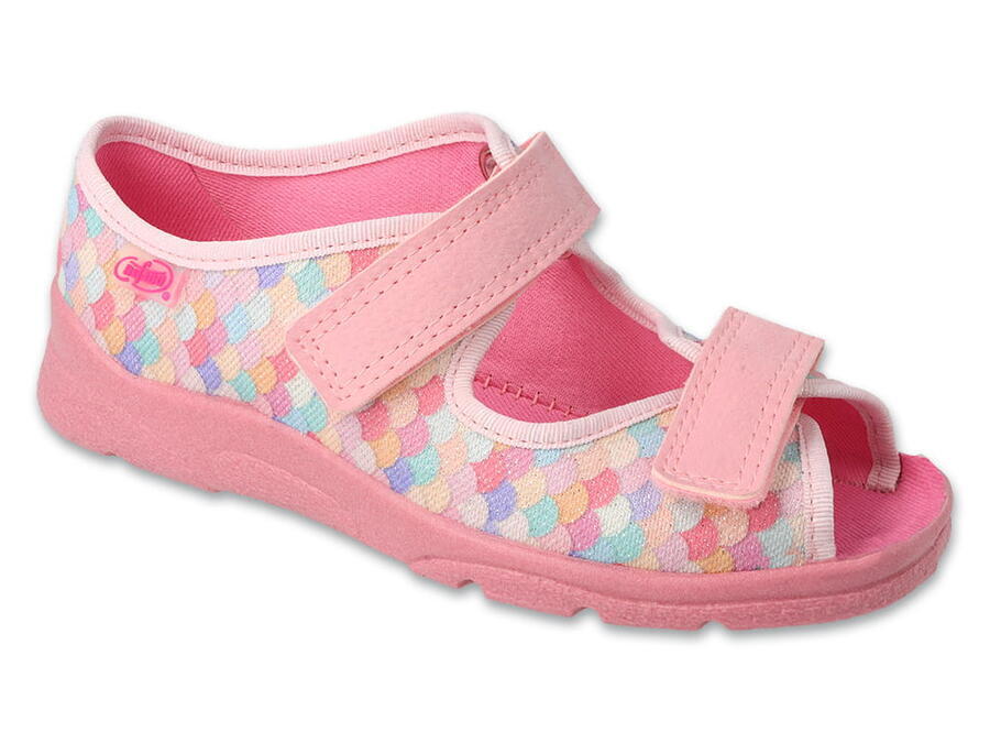 Bačkorky od značky Befado s vícebarevným vzorem. Přezůvky odpovídají veškerým nárokům kladeným na zdravé a pohodlné obutí doma i ve školce a škole.