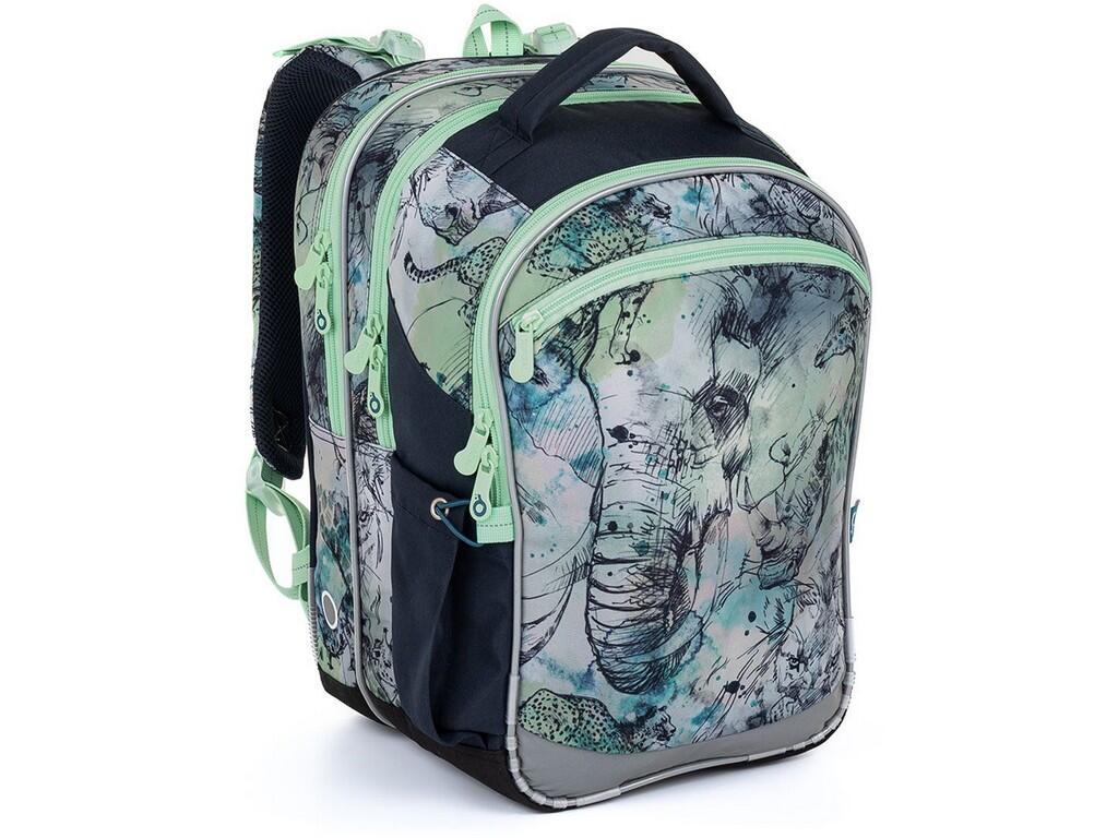 Khaki tříkomorový batoh se slonem a dalšími zvířátky se stane skvělým společníkem do první až páté třídy.