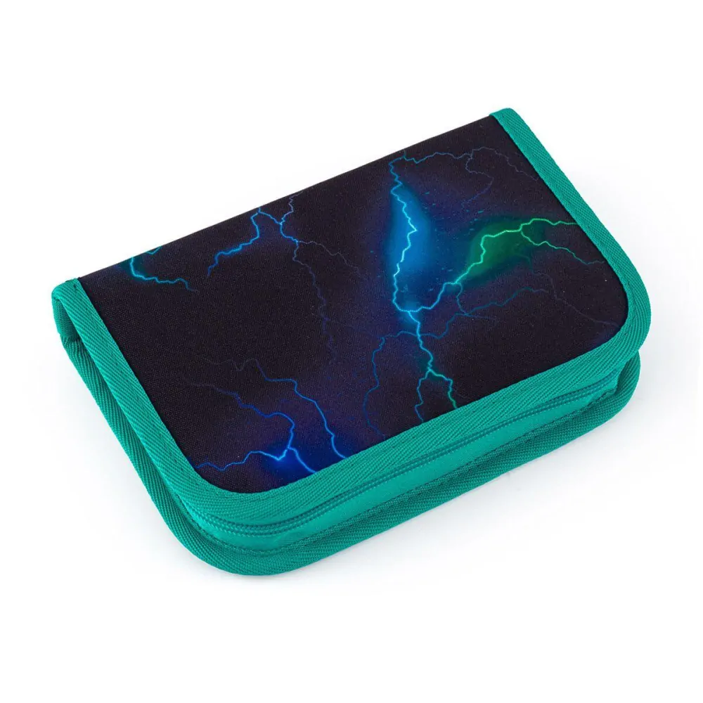Jednopatrové školní pouzdro se dvěma klopnami je vybaveno 21 klasickými gumovými úchyty na pastelky a fixy, třema širšími úchyty na pravítko, kružítko či nůžky a dvěma většími úchyty na gumu a ořezávátko. Pod klopou z průhledné folie najdete rozvrh hodin, druhé poslouží třeba i na taháky :-)