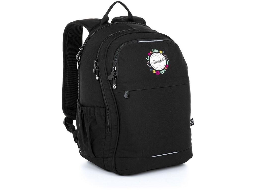 Dvoukomorový batoh v temně černé barvě, oživený vyšitými květy a stylovou nášivkou. Záda batohu jsou polstrovaná a anatomicky tvarovaná z měkké pěny. Uvnitř zadní komory je umístěna polstrovaná kapsa na notebook i tablet.