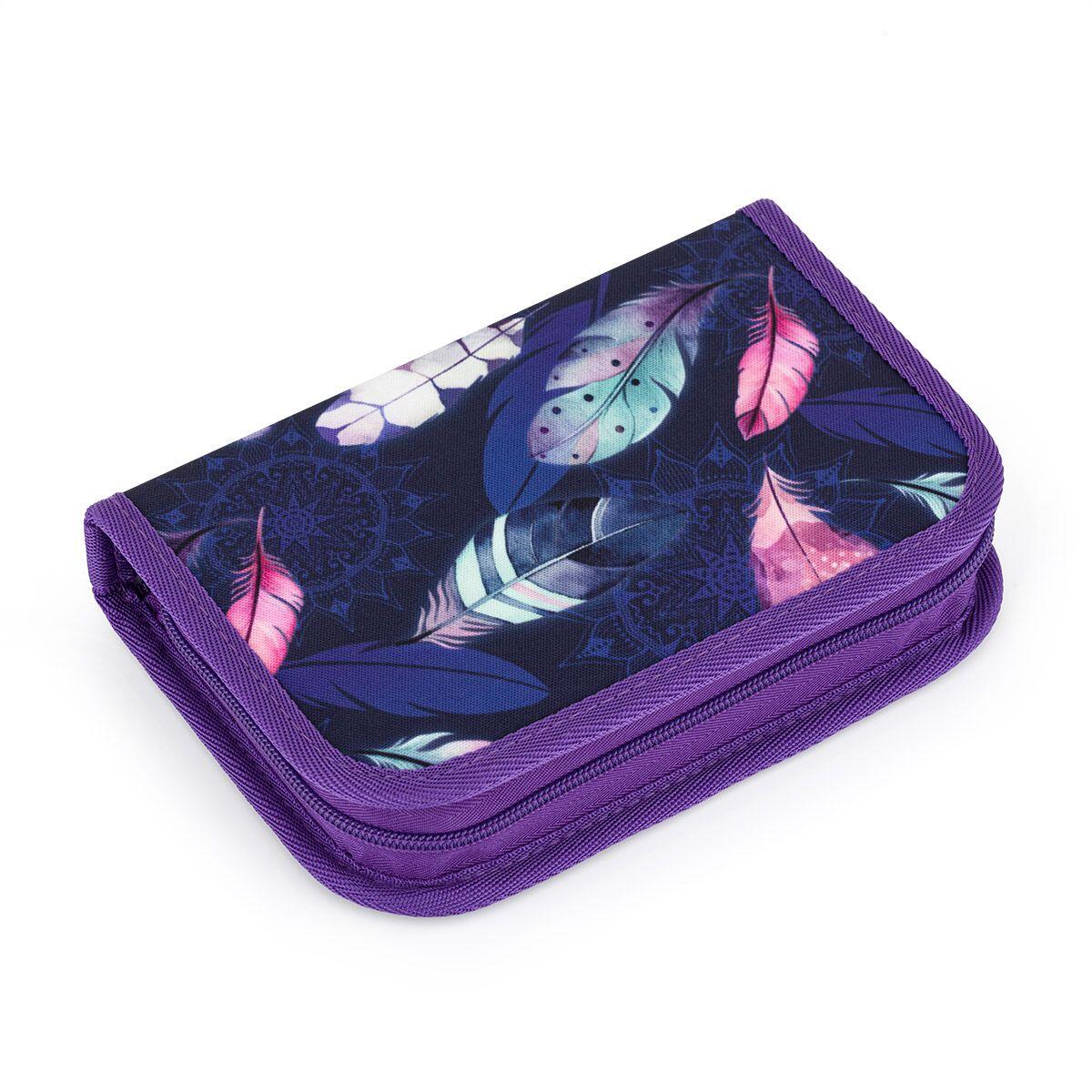 Jednopatrové školní pouzdro se dvěma klopnami je vybaveno 21 klasickými gumovými úchyty na pastelky a fixy, tři širší úchyty na pravítko, kružítko či nůžky a dva větší úchyty na gumu a ořezávátko.