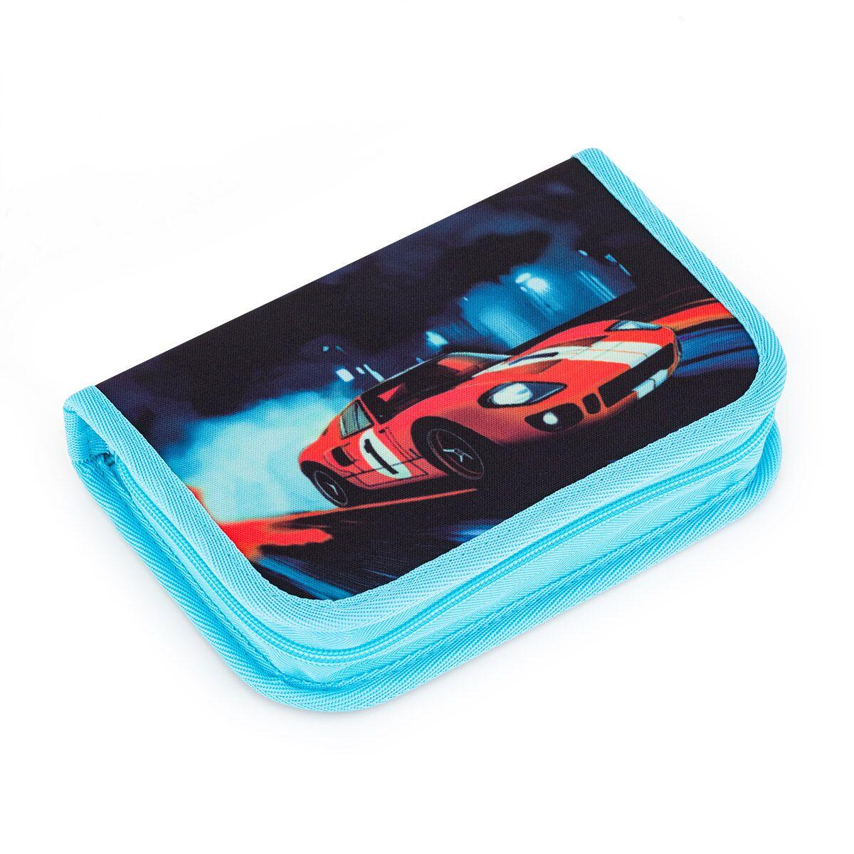 Jednopatrové školní pouzdro se dvěma klopnami je vybaveno 21 klasickými gumovými úchyty na pastelky a fixy, tři širší úchyty na pravítko, kružítko či nůžky a dva větší úchyty na gumu a ořezávátko.