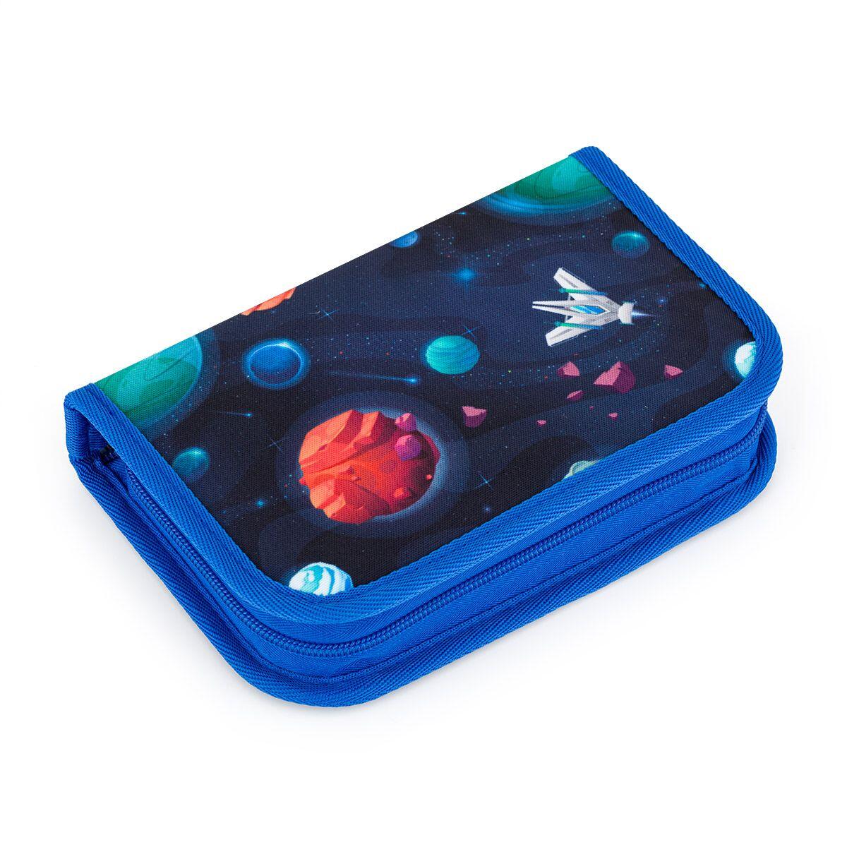 Jednopatrové školní pouzdro se dvěma klopnami je vybaveno 21 klasickými gumovými úchyty na pastelky a fixy, tři širší úchyty na pravítko, kružítko či nůžky a dva větší úchyty na gumu a ořezávátko.