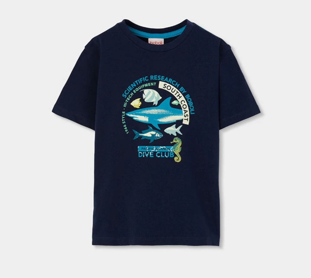 Námořnicky modré tričko Boboli má mořský motiv s rybami a mořským koníkem, což dodává zábavný nádech.